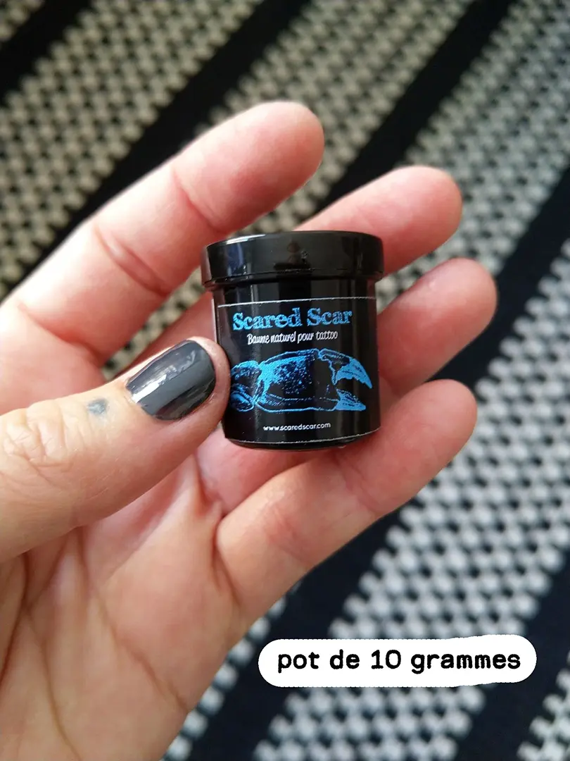 Le pot de 10 grammes est facilement transportable dans la poche et permet la cicatrisation d'un tattoo de 15 X 15 cm.